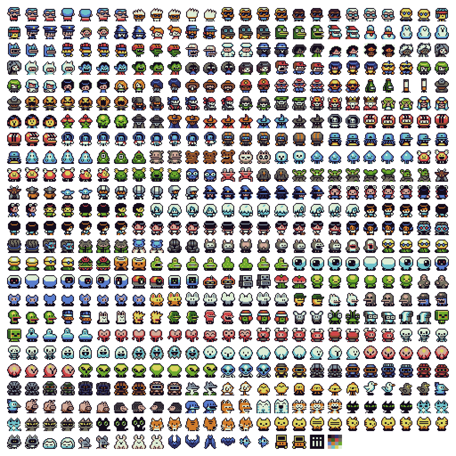 A charming collection of 100+ 16x16px. pixel characters with simple 2-frame animations — heroes, monsters, animals, and NPCs for your next indie game.